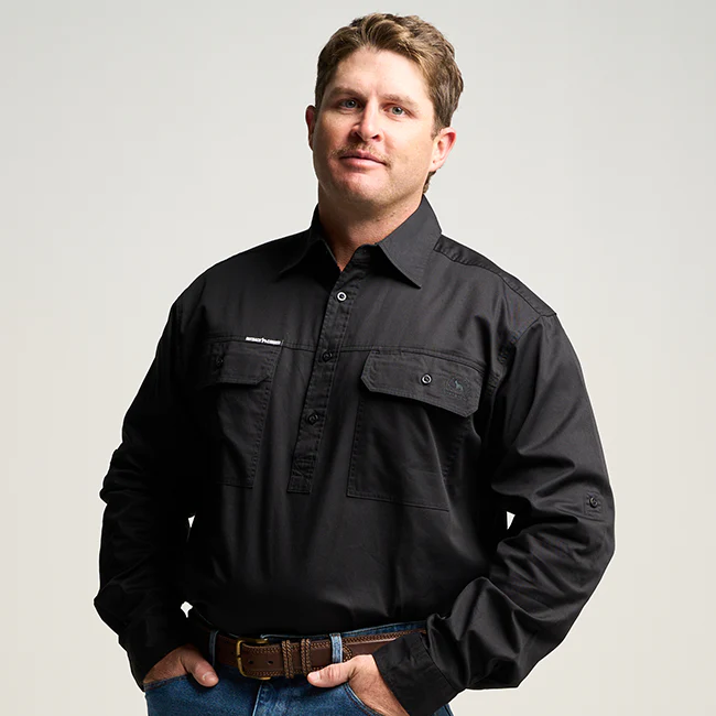 OBCMWS001-BLK KILCOY | Mens Half Button Long Sleeve Work Shirt - Black